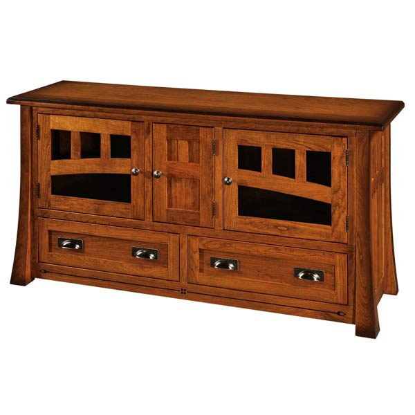 Standard Features: 1″ thick top, CD/DVD accessible drawer, dovetailed drawer boxes, soft close undermount slides, dyed tupelo inlays in the base, smoked glass in doors for easy remote operation, 1 adjustable shelf behind each door, soft close concealed hinges, shown with standard hardware.