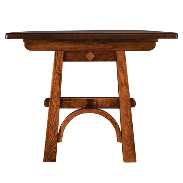 The Eastwood narrow trestle table is shown in Rustic Cherry wood with a smooth top and grain running the long way.