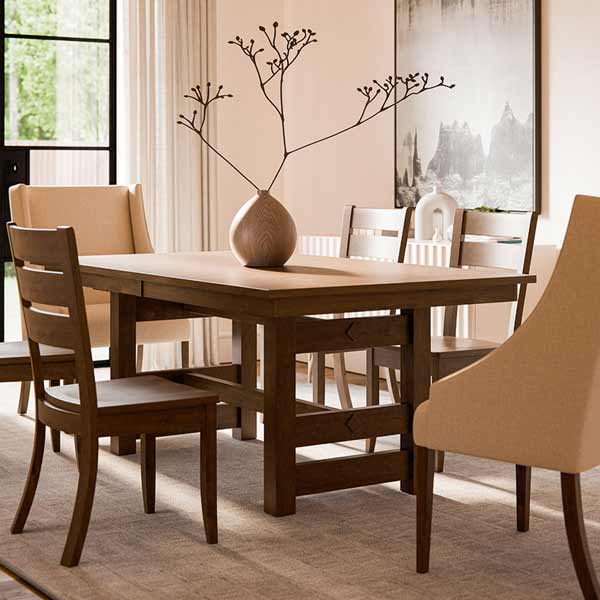 The Greenwood Trestle table has a 1″ thick rectangle top with a mission edge standard. Available in both a 42″ and 48″ wide.