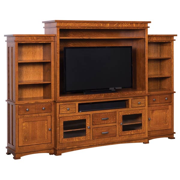 Standard Features: adjustable TV height, adjustable wood shelves, 2 each side, 1 behind each door, soft close doors, full extension drawers, 1″ tops, and standard hardware.