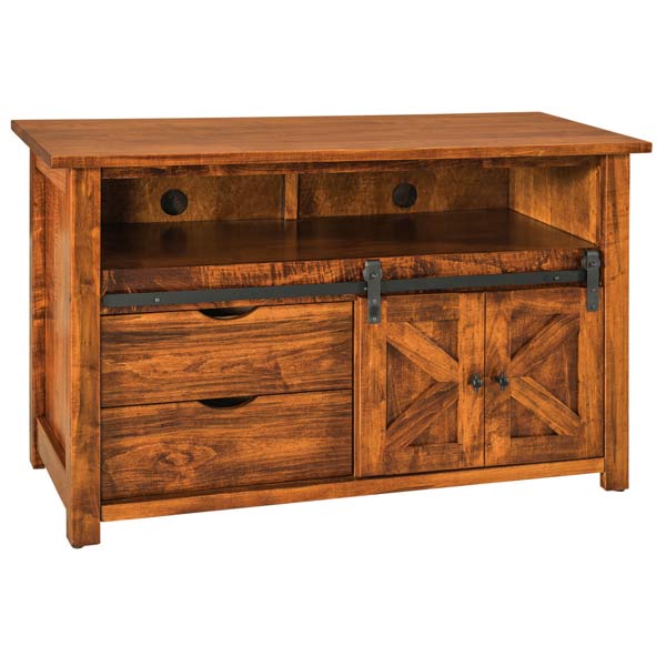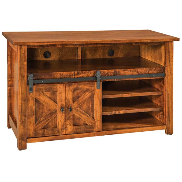 Standard Features: 1″ thick top, no-screw access removable backs, barn door style doors with exterior track system, 2 pullout DVD drawers, 2 adjustable shelves on the right side, shown with standard hardware.