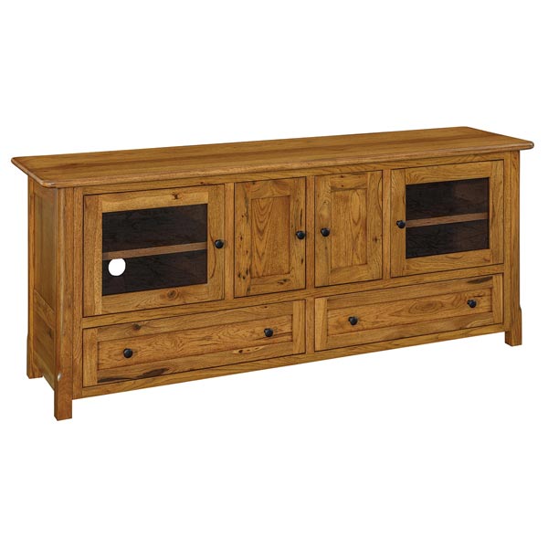 Standard Features:  1″ thick top, adjustable shelf behind 3 doors, 2 drawers behind middle right door, smoked glass in the doors for easy remote operation, dovetailed drawer box, soft close undermount slides, CD / DVD accessible drawers, soft close hinges, shown with standard hardware.